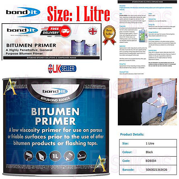 Bond It Bitubond Range Bitumen Roofing & Flashing Primer Solution Black 1L Litre